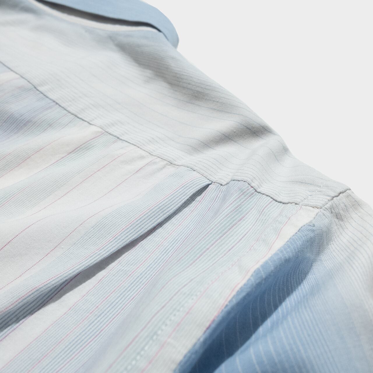 そんなに名の通っていないブランドではあるもののユーロっぽいブランドらしく、アメリカにはない独特の抜け感が魅力的な1枚で遠目から見ると水色と白のボーダーに見えますが寄ると実は非常に細かいマルチストライプ構成。