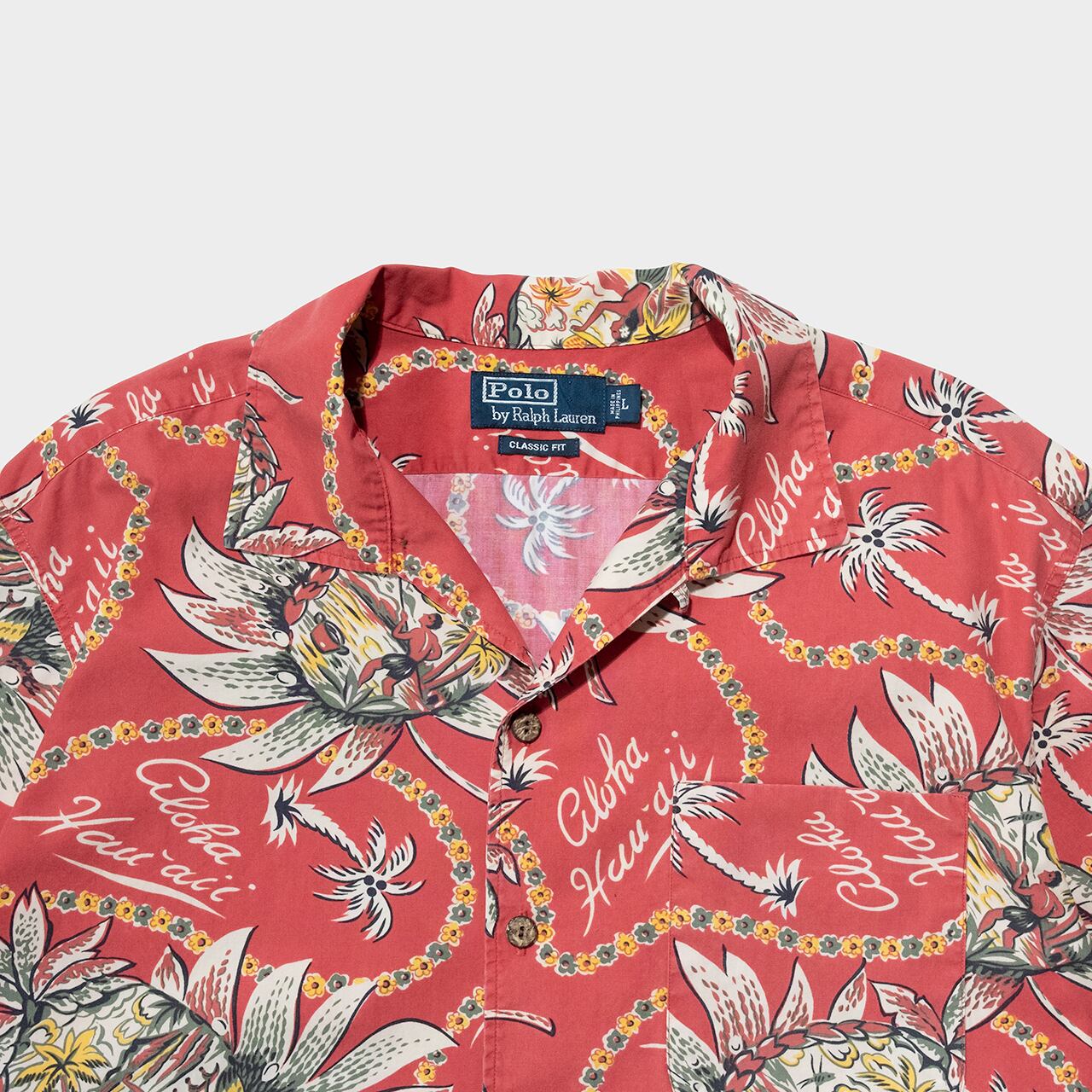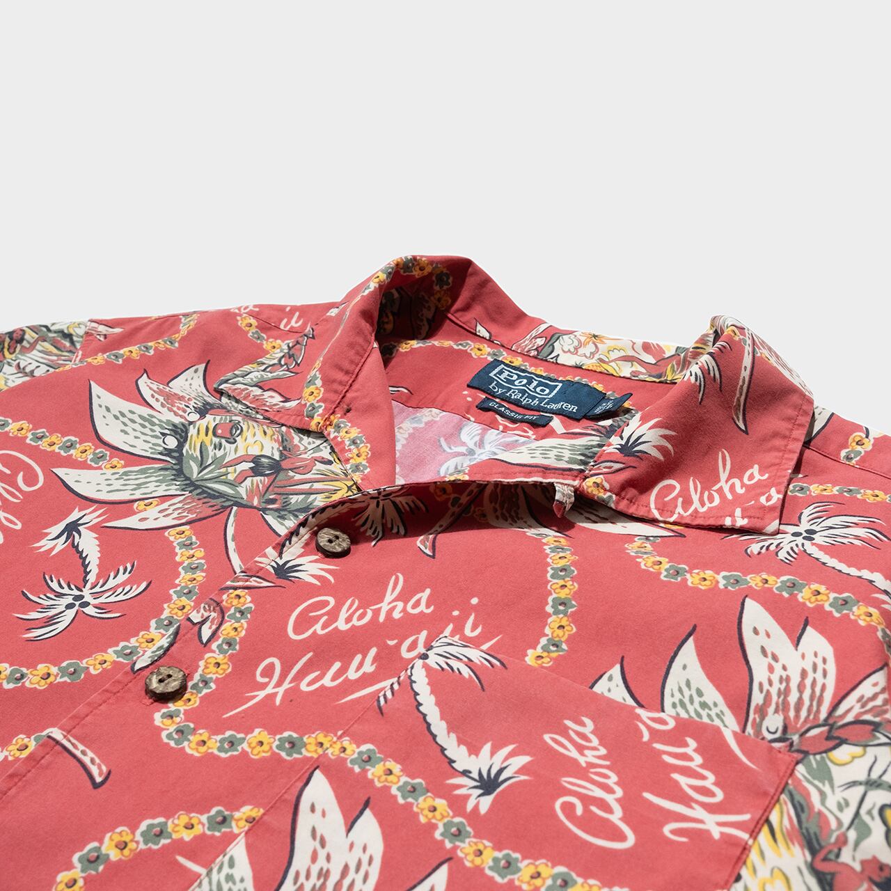 フェードしたような彩度抑えめの雰囲気抜群なレッドベースにウッドボタンとラルフのオープンカラーでもアロハ感満載の1枚。
