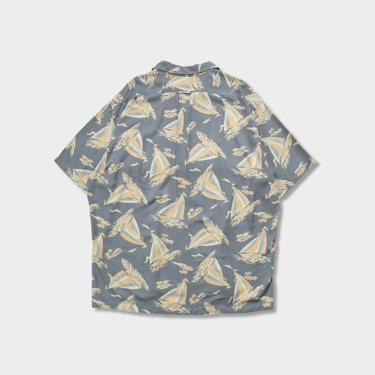 水面に浮かぶヨットの大群がプリントされた、なんとも夏らしいデザインですがニュアンスカラーのカラーリングがTHE・アロハみたいなガチャガチャ感がなくて大人に着れる1枚。