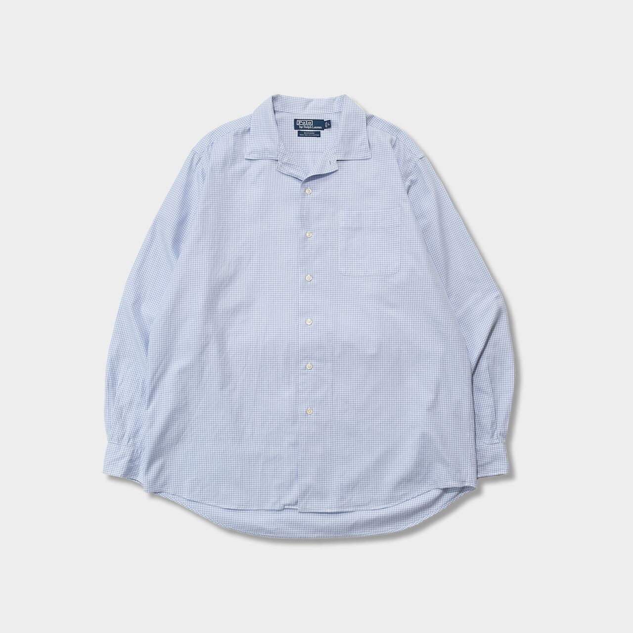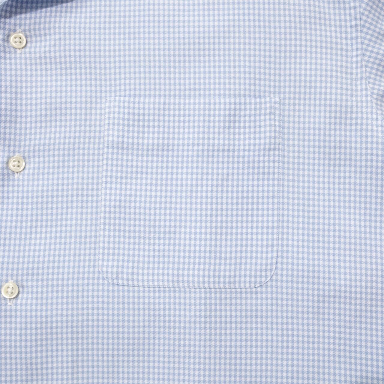 カラーは柔らかな印象が際立つペールブルーのマイクロギンガムチェック。オープンカラーがちょっと強すぎるって方でも着やすいバランス感が絶妙の1枚◎