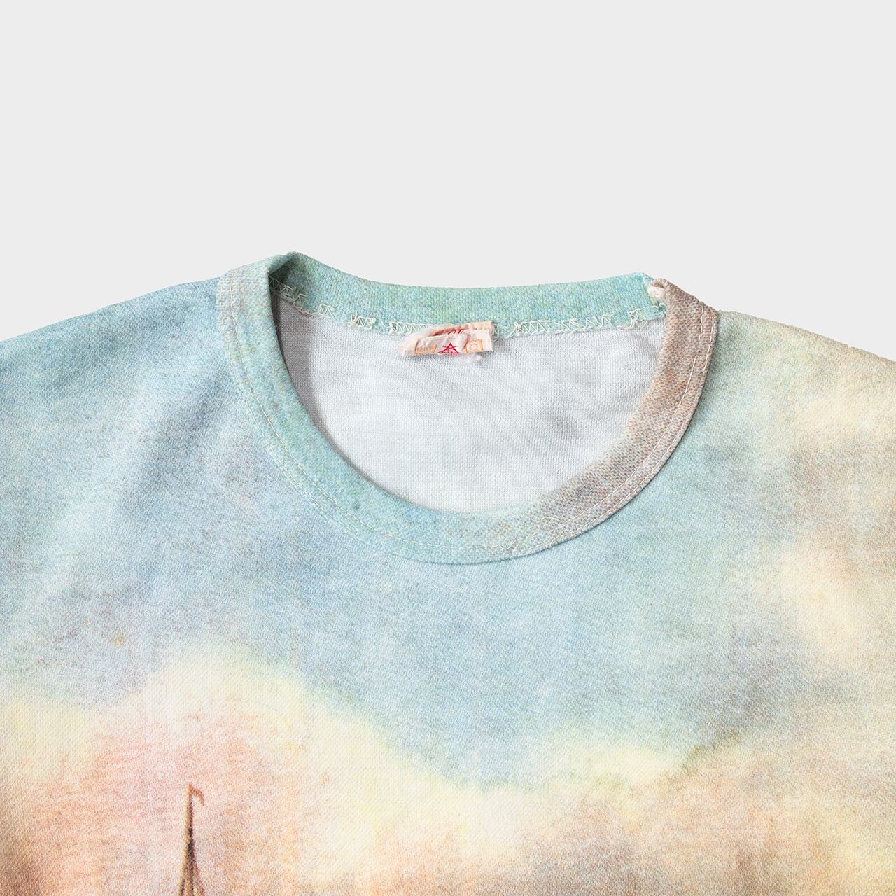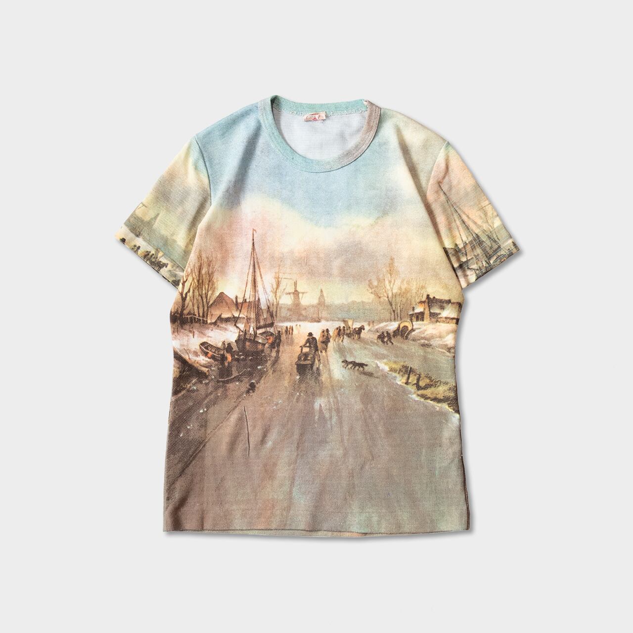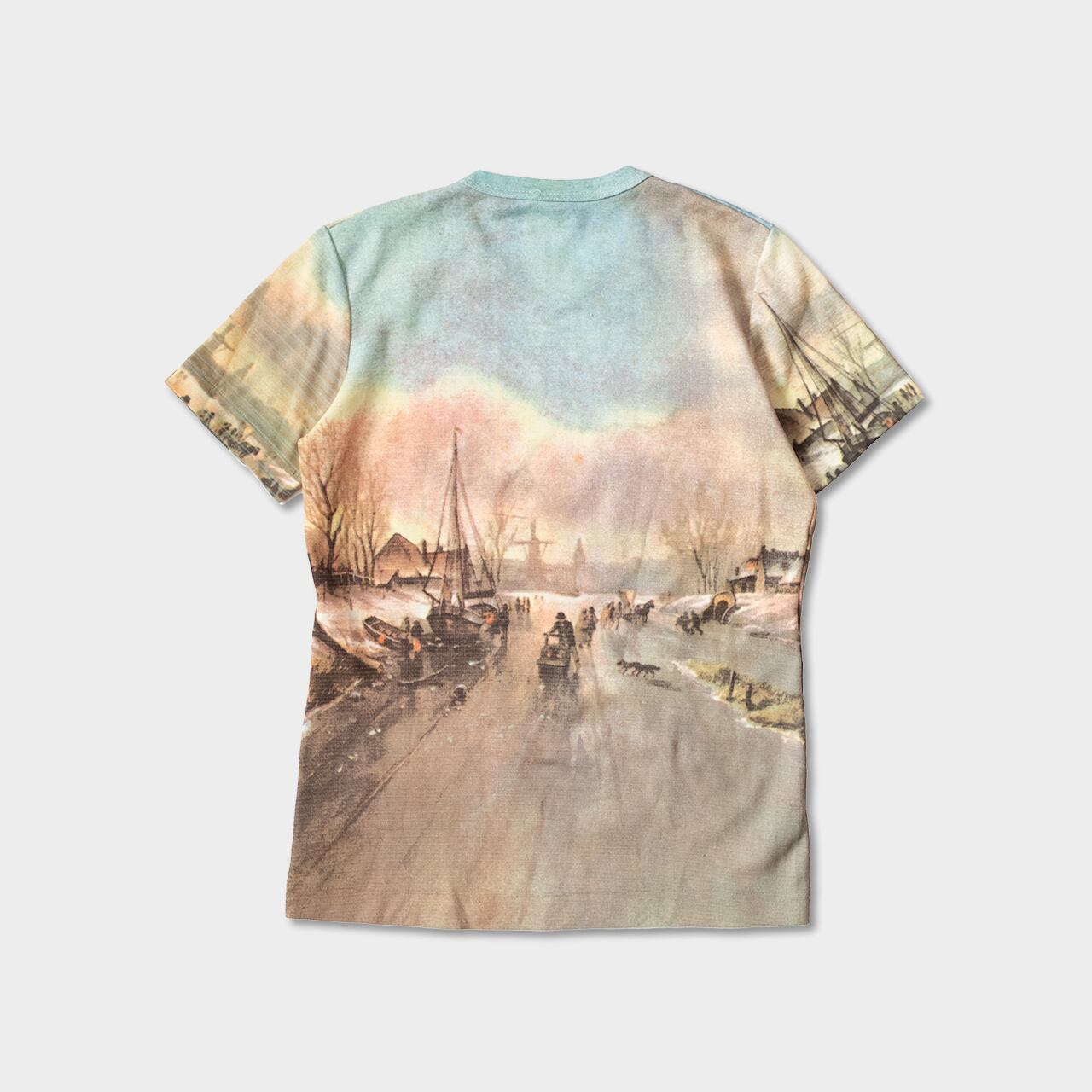 ポリエステルのニット素材の表裏両面に描かれたデザインは美術館で見る印象派の絵画のようです。美しいーとため息出そうな1枚!